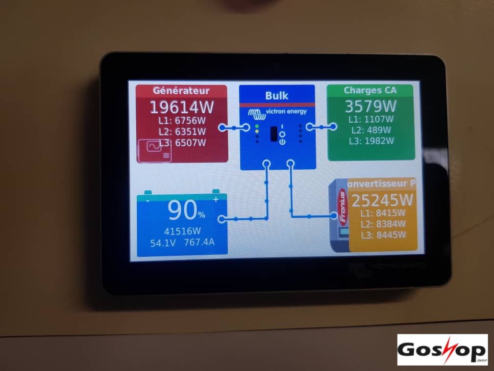 - 6 convertisseurs-chargeur Victron Quattro 48/15 000/200 donnant une puissance totale de 90 KVA,