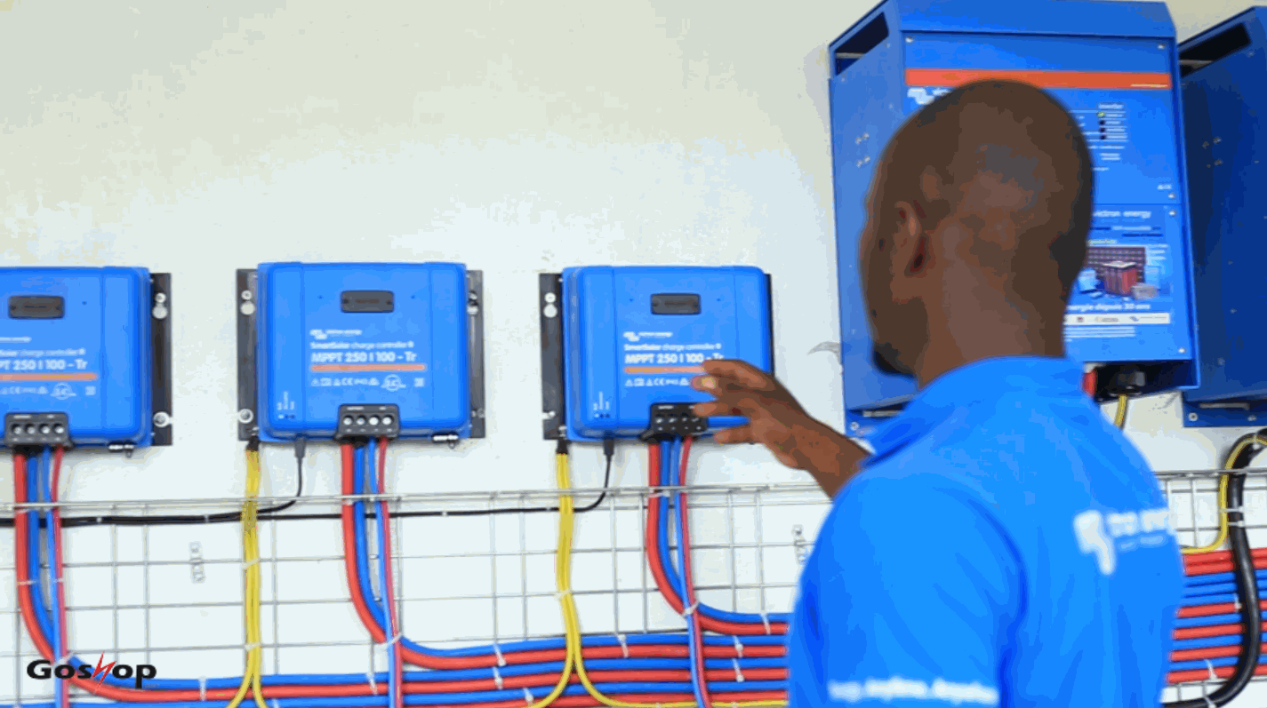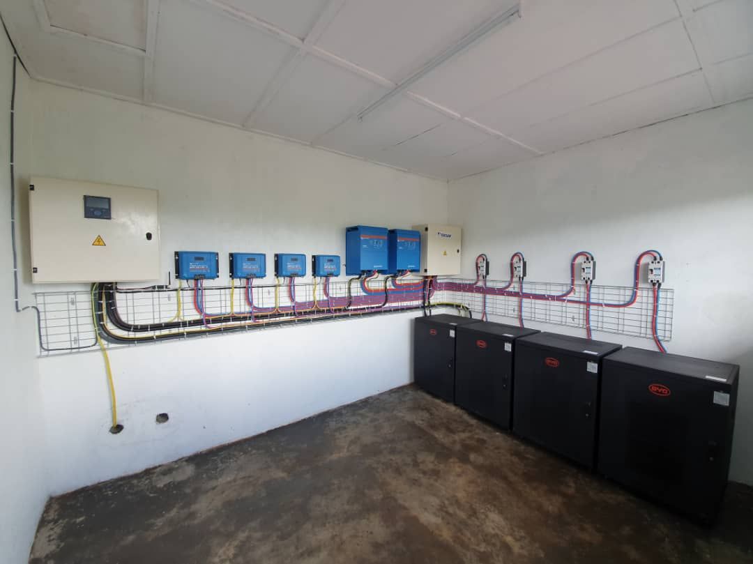 Depuis Janvier 2020, la centrale marche et alimente au tour de 302 ménages. La micro-centrale porte un système solaire taillé sur le besoin en énergie et le nombre des ménages à alimenter. Ce système est composé d’un champs Solaire de 64 panneaux, de 4 régulateurs de charge MPPT 250V/200A de victron Energy, c’est à dire pour une moyenne de 16 panneaux par régulateur, un total de 16 batteries BYD au lithium reparties en 4 racks de 2.5 KWh chacune et font un total de 40 KWh, deux Convertisseurs Quattro de 10 KVa chacun couplés en parallèle, ce qui fait au total 20 Kva mais aussi d’un Color Control GX pour assurer le contrôle à distance grâce à l’application VRM de Victron Energy. Le système est bien protégé par 4 parafoudres Citel DC, en raison d’un parafoudre par régulateur, 4 parafoudres AC et un paratonnerre Indelec. Il s’agit d’un système automatique et un Générateur Teksan de 50 Kva pourra démarrer automatiquement en cas de problème ou de décharge des batteries suite à une persistance d’un mauvais temps.