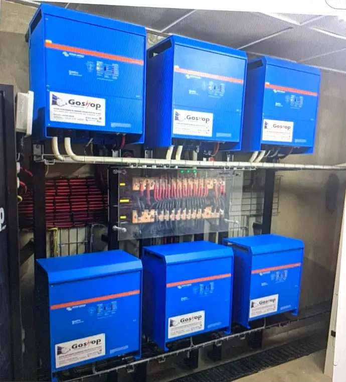 À l'Hôpital Unichir Beni, la stratégie de sauvegarde est constituée de six convertisseurs Victron Quattro d'une puissance de 15 kVA chacun. Ces appareils fonctionnent sur un système à courant continu (DC) de 48 volts et génèrent un courant alternatif (AC) de 230 volts en sortie. Chaque onduleur peut fournir une puissance apparente de 15 kVA, ce qui permet au système d'assurer une capacité totale atteignant 90 kVA grâce aux six unités déployées. Ce mécanisme garantit une fourniture d'énergie adéquate pour répondre aux besoins énergétiques de l'hôpital, même en cas de coupures de courant.