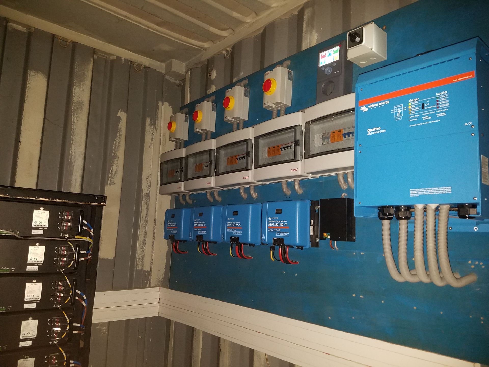 Le système était constitué d’un champ solaire de 70 panneaux solaires Poly de 320w/45 Volts chacun, 16 batteries au lithium 2.5KHW/51.2v chacune, de 4 régulateurs de charge SmartSolar MPPT 250/100 chacun, d’un convertisseur/chargeur Quattro 10 000VA/48Volts et d’une puissance de charge de 6 700 watts et en fin d’un contrôleur CCGX avec une puissance des batteries configurée de 800 ah, équipé d’une alarme sonore de tension faible, la console à distance activée avec une connexion au réseau internet pour le démarrage automatique du générateur en cas de déchargement.